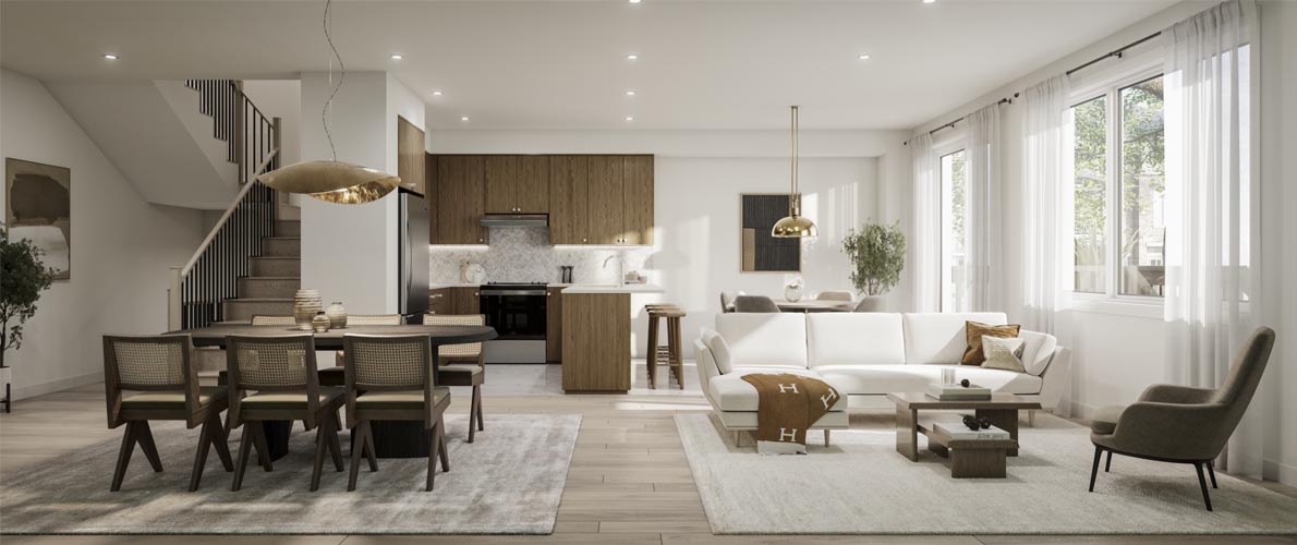 This collection of modern and spacious townhomes creates a desirable enclave in an affluent community. Perfect for first-time homebuyers and growing families, these Back-To-Back Townhomes showcase thoughtfully designed 3-bedroom layouts with expansive living areas and open-concept designs that cater to the diverse lifestyles of their residents.