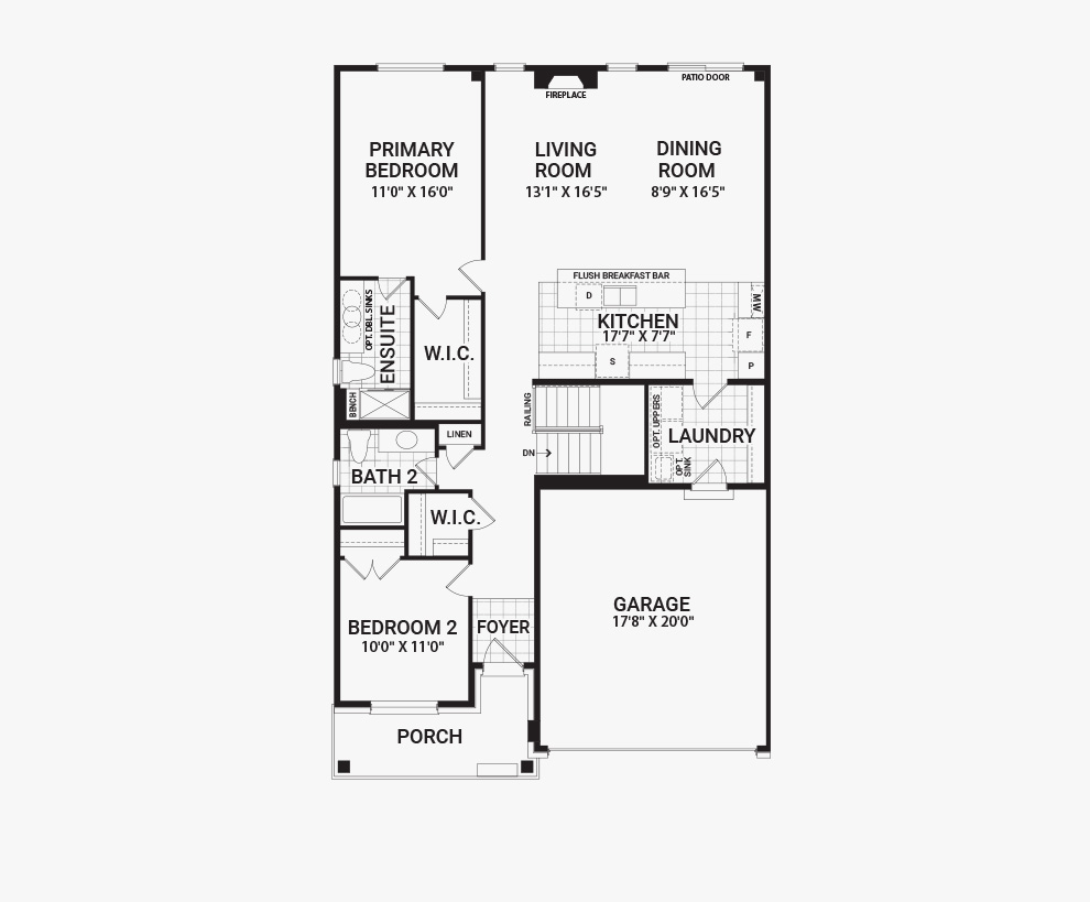 The Pratt End is a Bungalow Townhome exclusive to Mahogany, Manotick. As an end unit, you're provided with an additional window, which provides more natural lighting in your home. The Pratt End features a spacious Primary Bedroom with a large walk-in closet and an Ensuite. The Kitchen overlooks the large Living Room that features a gas fireplace, and Dining Room. Bedroom 2 offers its own walk-in closet. You're never short of space in The Pratt End, with a Flex Plan available to provide you with a Finished Basement. The Pratt End also features a Double-Car Garage.